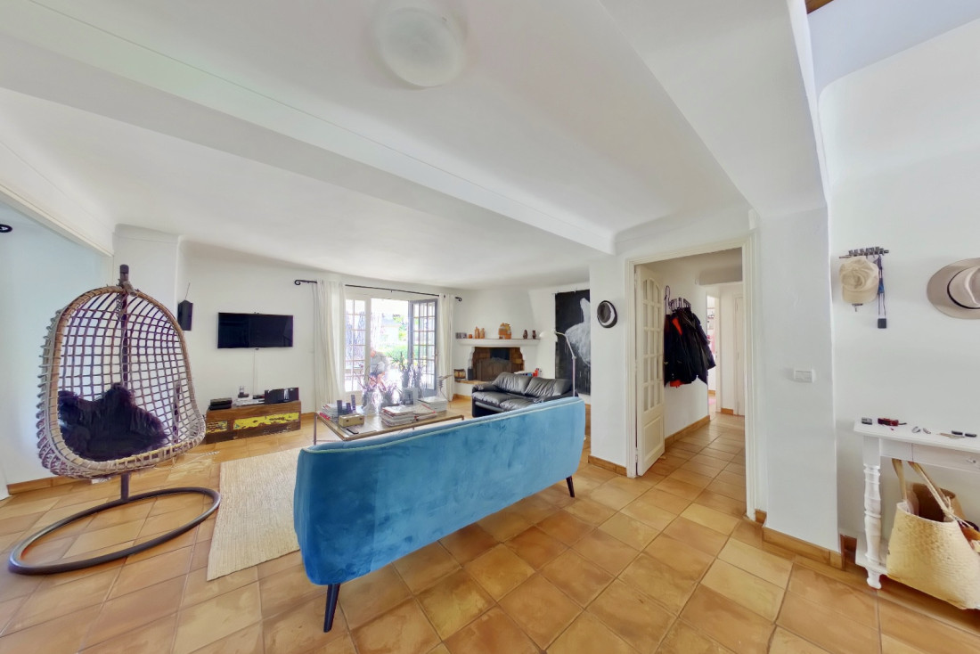 Hall, living room with fireplace opening onto a covered terrace,