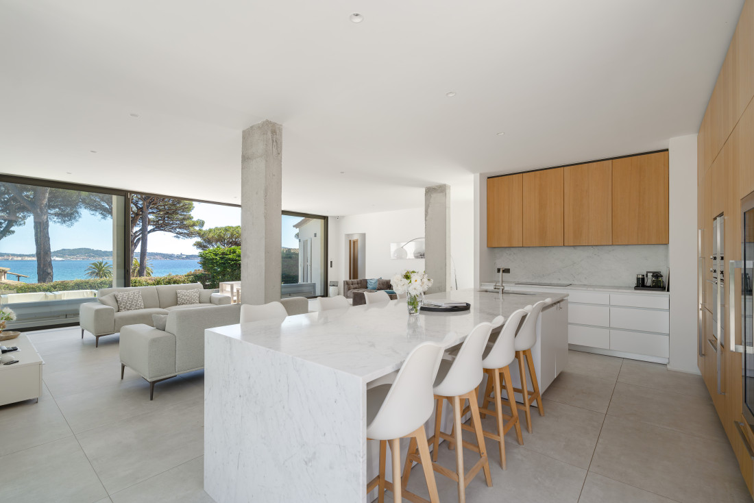 Fully-equipped open-plan kitchen with huge Carrara marble island and access to a pergola with summer dining room