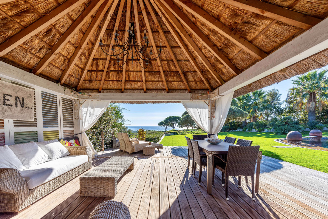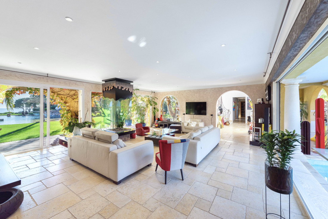Spacious reception room with sea view, glazed fireplace, billiards table, dining room opening onto covered terrace