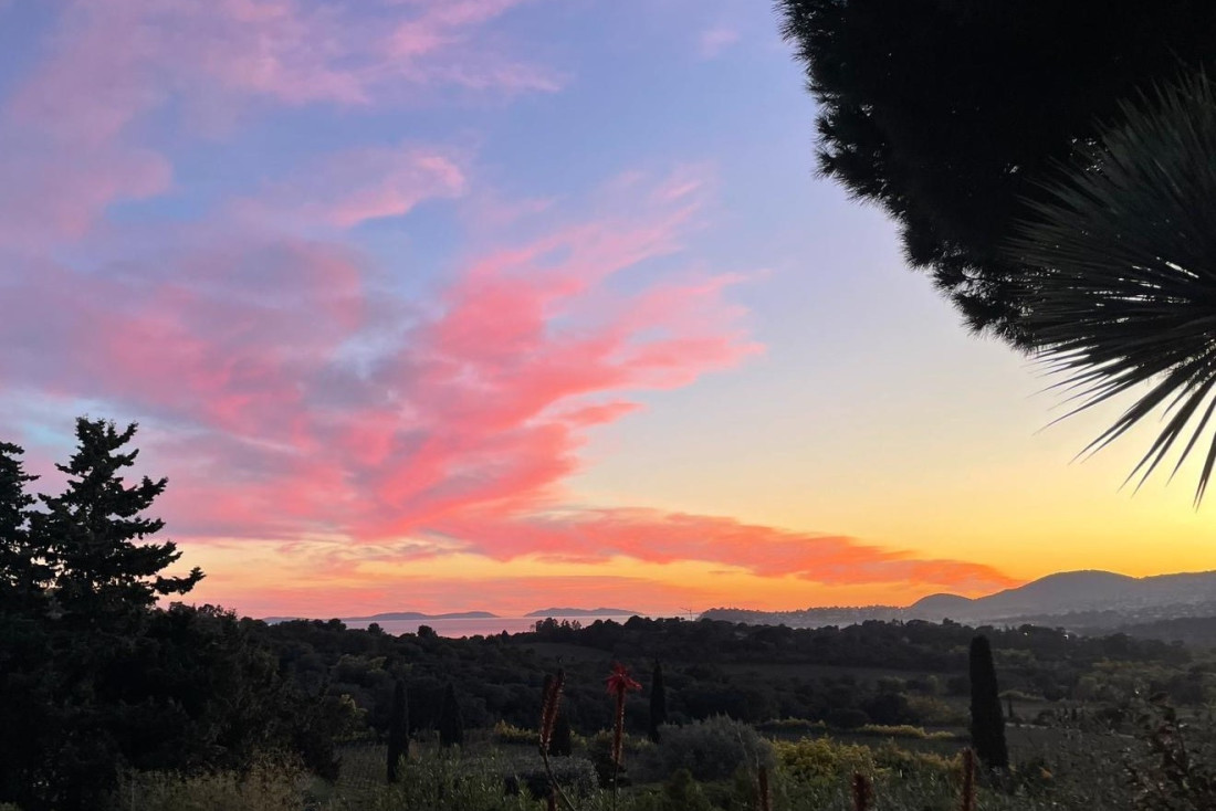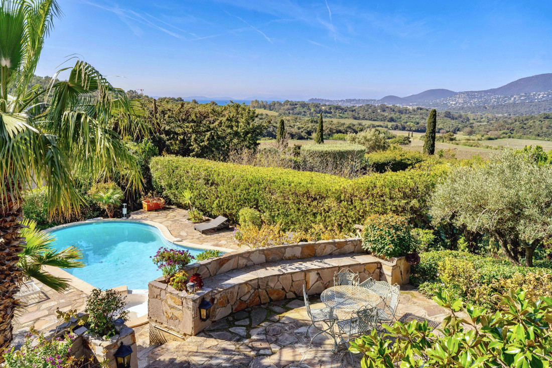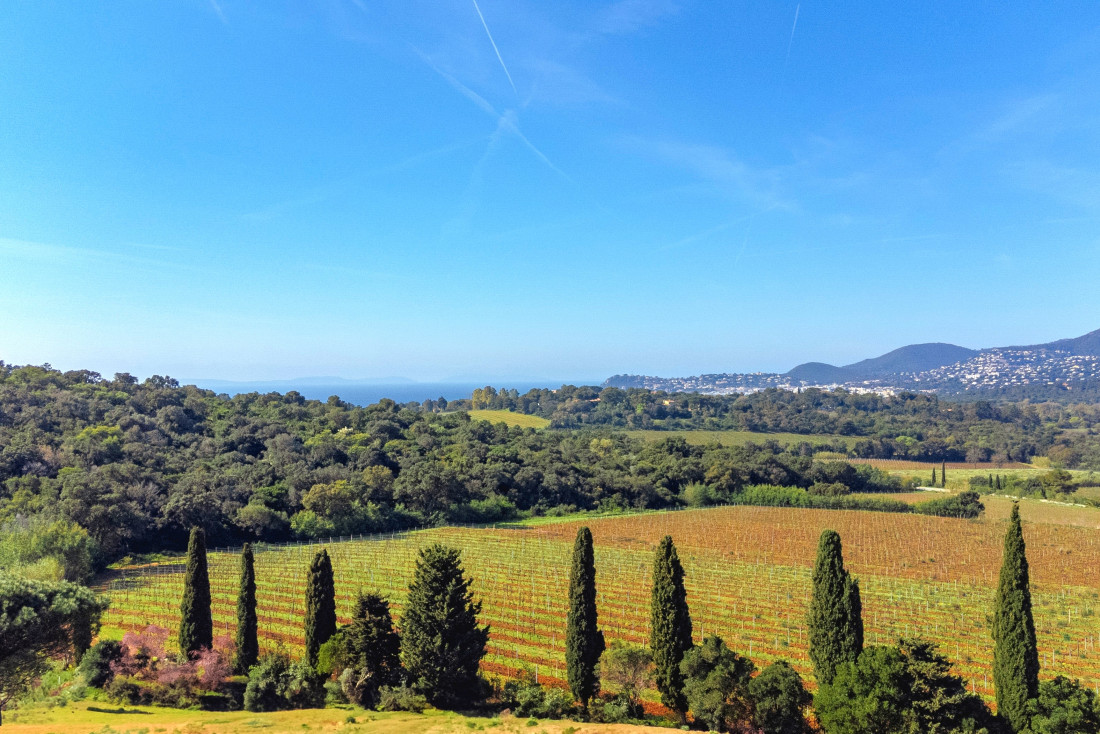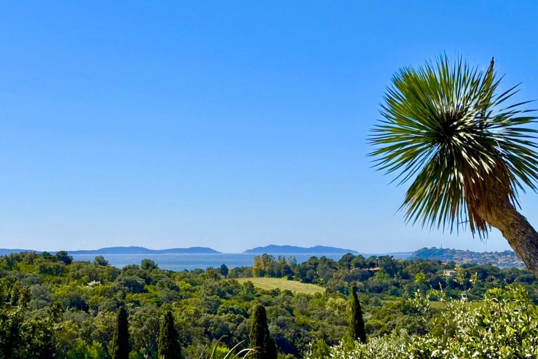 This sea-view villa boasts breathtaking panoramas of the Golden Islands, Cavalaire Port, surrounding vineyards, and rolling hills. Its south-southwest orientation ensures optimal sunlight year-round.