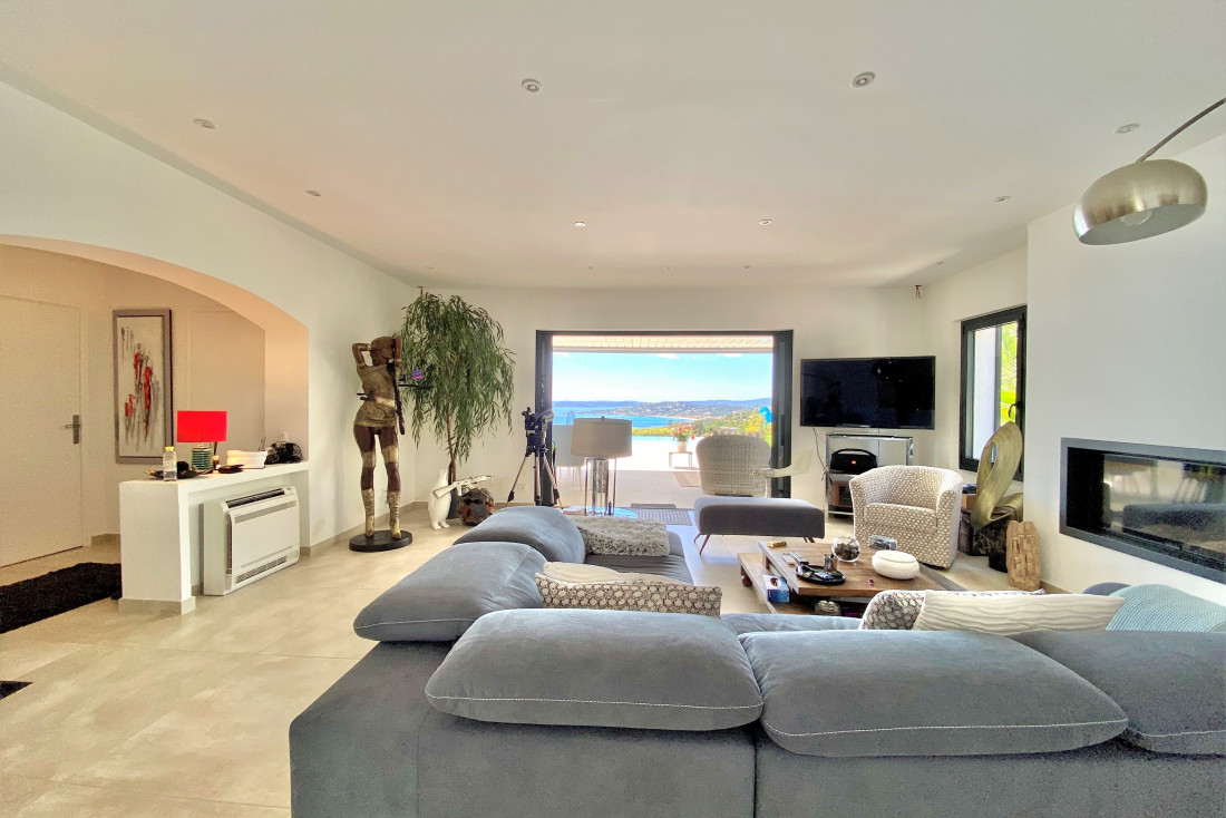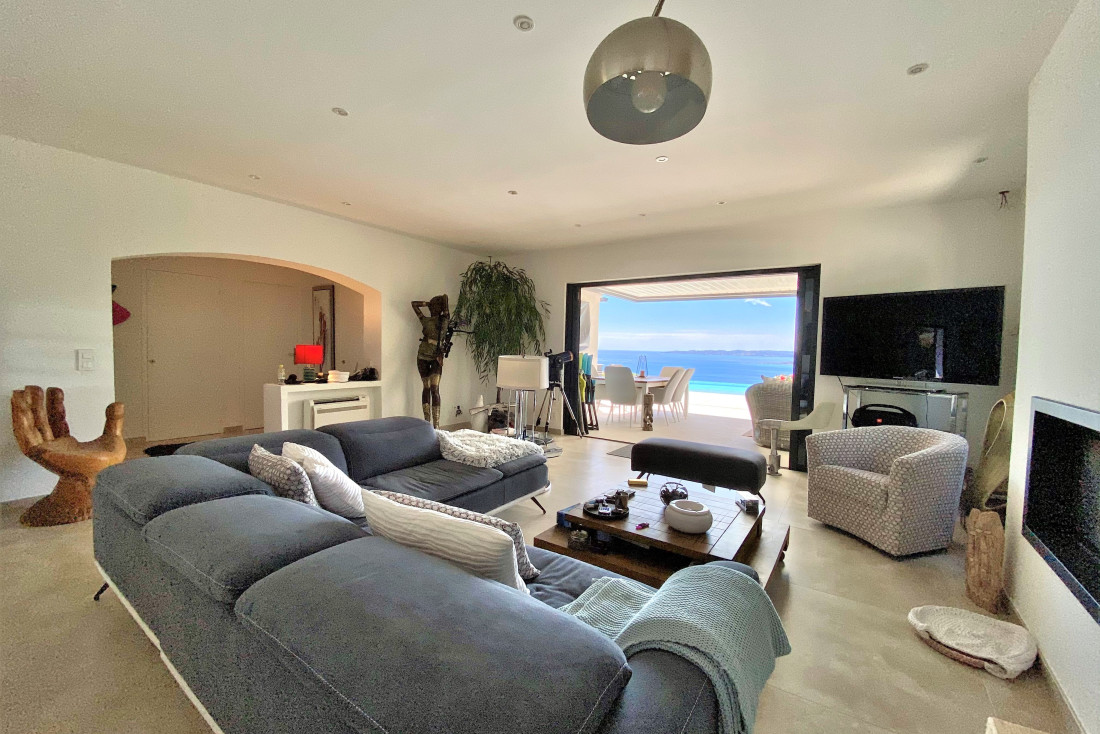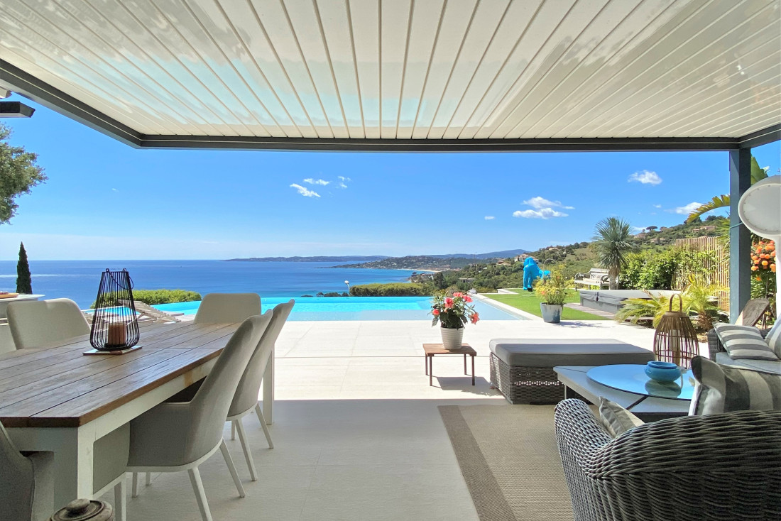 Living room with insert fireplace opening on a large bioclimatic pergola extended by a heated infinity pool surrounded by large terraces and a jacuzzi;