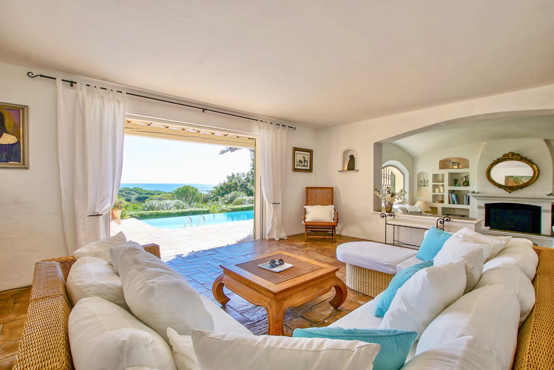 Triple reception area of 70m² with fireplace and dining room opening onto a large terrace with 10 x 5 m heated infinity pool