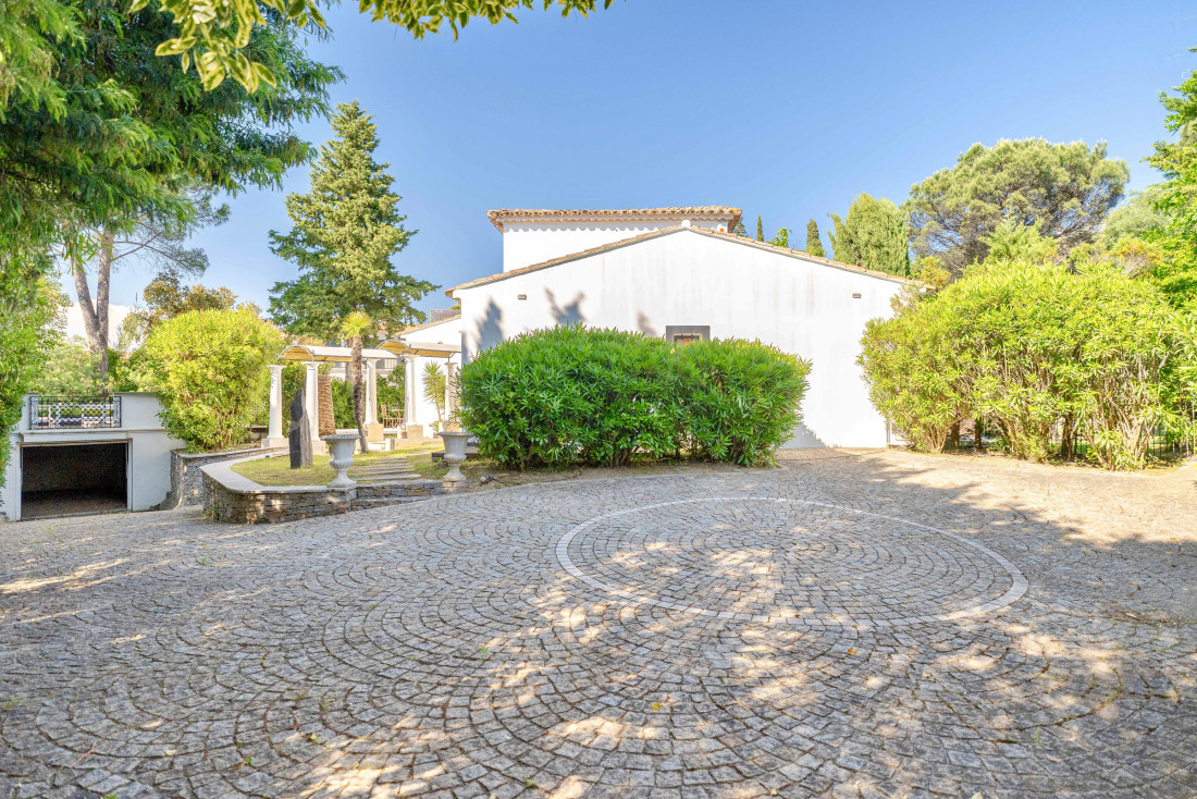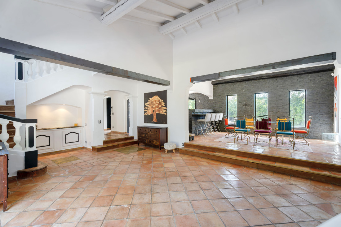 Le hall d’entrée doté de placards, mène vers un vaste salon où une cheminée apporte une touche chaleureuse. Les grandes baies vitrées ouvrent sur une terrasse ensoleillée, prolongeant l’espace de vie vers l’extérieur. La cuisine américaine s’ouvre sur une salle à manger conviviale, elle-même connectée à une terrasse extérieure aménagée avec une cuisine d’été – l’endroit idéal pour des repas en plein air sous le soleil de la Côte d’Azur.