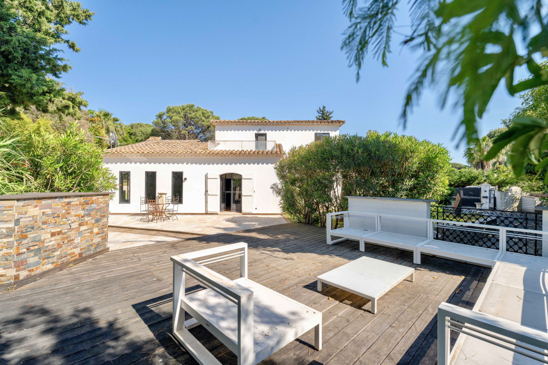 La villa compte trois chambres au rez-de-chaussée, dont une avec salle de bains, offrant un confort optimal pour la famille ou les invités. À l’étage, une suite parentale avec dressing, salle de bains et terrasse tropézienne invite à la détente dans un cadre intimiste et lumineux.