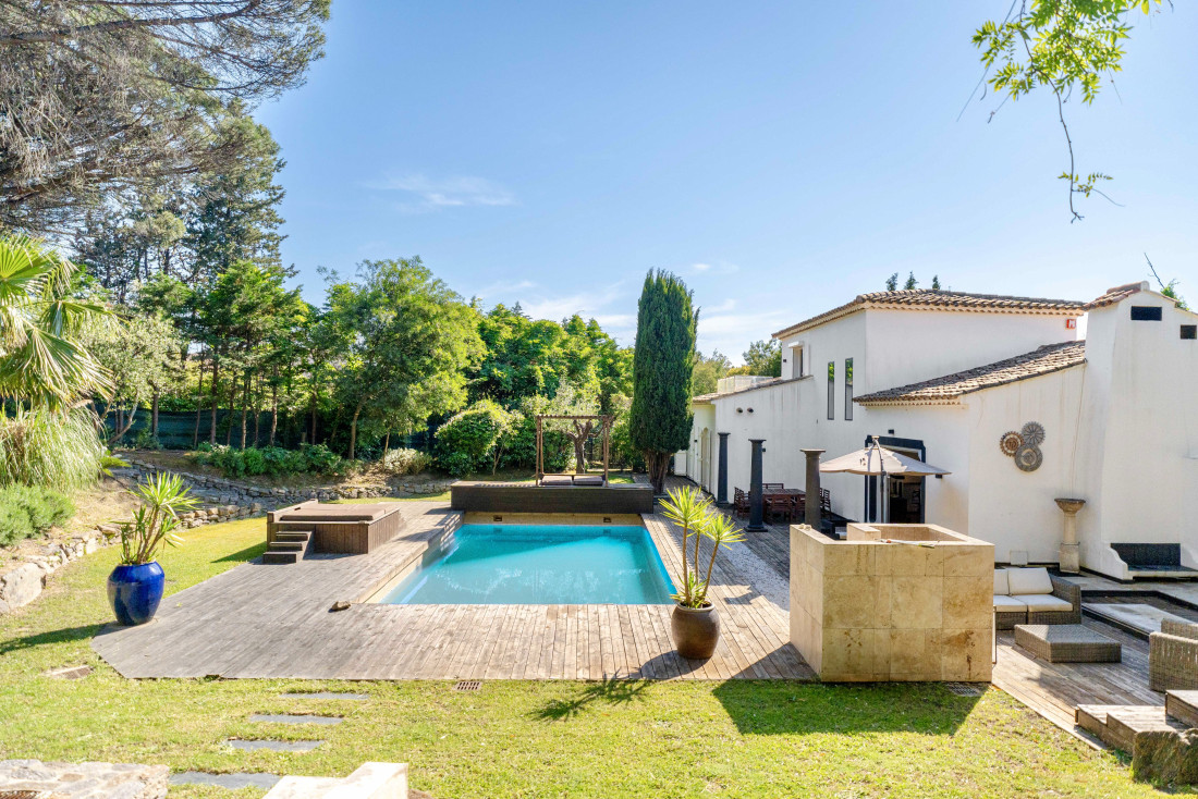 Le jardin plat et paysager, entretenu avec soin, entoure une piscine chauffée bordée de terrasses. Cet espace extérieur, sans dénivelé, est parfait pour profiter du soleil toute la journée, que ce soit pour des bains rafraîchissants ou des moments de détente en plein air.