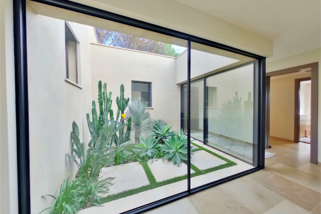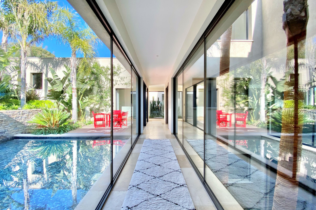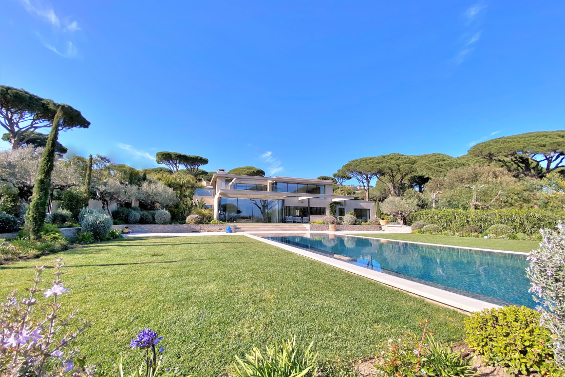 Le terrain plat et magnifiquement paysagé abrite des essences végétales rares et une piscine miroir chauffée de 17 x 6 mètres. Sécurité et technologie sont également au rendez-vous avec un système d’alarme intérieur et extérieur, des caméras de surveillance, une domotique intelligente, l’air conditionné et un chauffage au sol pour un confort absolu en toutes saisons.
