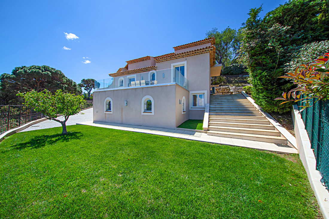 Villa vue mer à vendre à Grimaud, nichée au calme sur les hauteurs sécurisées du domaine prestigieux de Beauvallon Bartole. Entièrement rénovée dans un style contemporain alliant élégance et matériaux haut de gamme, cette propriété allie confort et raffinement avec une allée pavée menant à des parkings privatifs et un garage fermé.