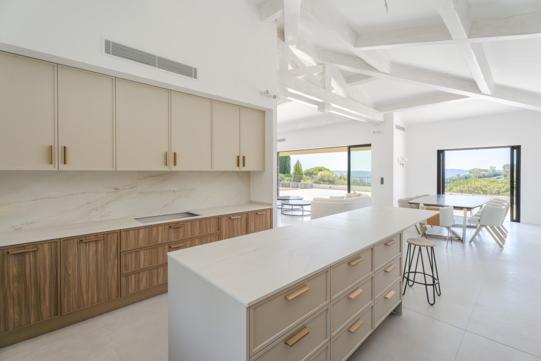 Cuisine américaine entièrement équipée avec cave à vin intégrée.