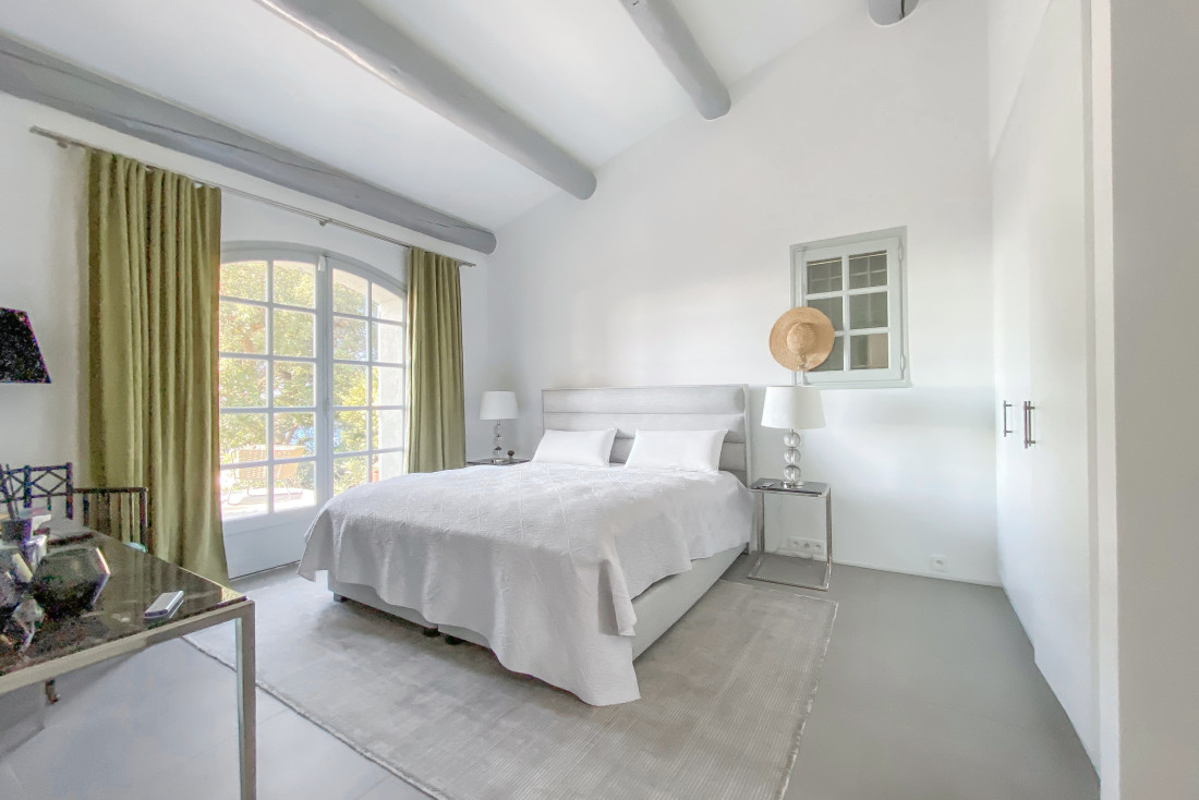 Côté nuit, la villa propose deux chambres en suite avec salles de douche et WC, ainsi qu’une chambre de service indépendante. À l’étage, un bureau en mezzanine et une somptueuse suite parentale avec terrasse tropézienne, salle de douche, WC et dressing offrent un havre de paix avec une vue imprenable sur la mer.