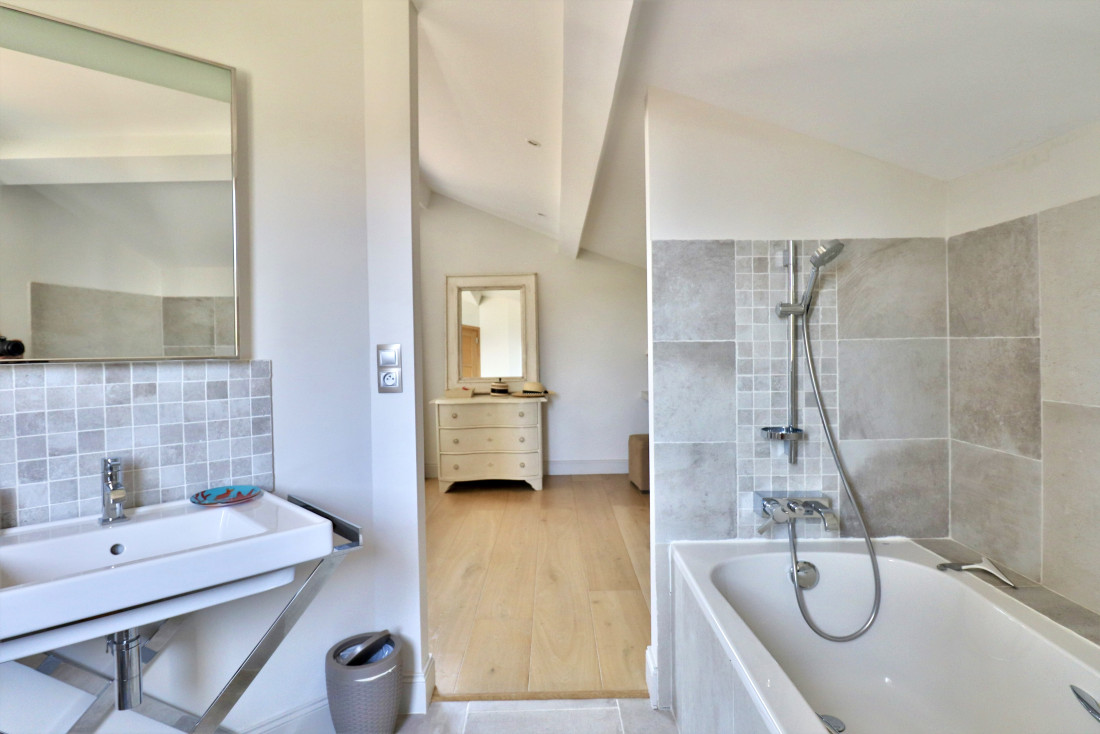 À l’étage, deux chambres en suite avec salles de douche et WC privatifs bénéficient chacune d’une terrasse individuelle, offrant un espace extérieur intimiste avec vue sur la mer ou le jardin. Au dernier niveau, deux autres suites parentales avec salles de bains élégantes complètent cet ensemble, garantissant confort et intimité pour tous les occupants.