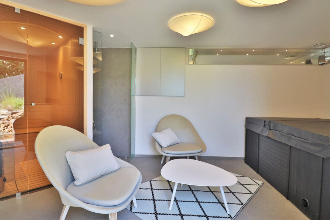 À l’extérieur, un havre de paix vous attend : une piscine à débordement chauffée, un jardin paysager soigné, ainsi qu’un sauna et un jacuzzi pour une expérience bien-être ultime. Climatisée pour un confort optimal toute l’année, cette villa représente l’alliance parfaite entre luxe, modernité et art de vivre méditerranéen.