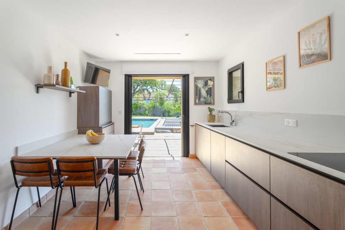 Cette villa propose quatre chambres en suite, dont trois de plain-pied, offrant un confort optimal pour une famille ou pour une location saisonnière. Chaque chambre dispose de sa propre salle de bain, garantissant intimité et praticité. Les matériaux nobles et la décoration soignée renforcent le charme provençal tout en apportant une touche de modernité.
