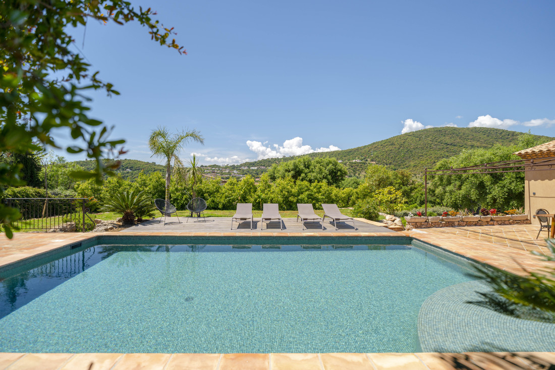 Le terrain plat et paysagé, facile à entretenir, est agrémenté d’une piscine entourée de terrasses ensoleillées, idéale pour les baignades et les moments de détente en famille ou entre amis. L’espace extérieur, à la fois intime et spacieux, est parfait pour profiter du climat méditerranéen tout au long de l’année.