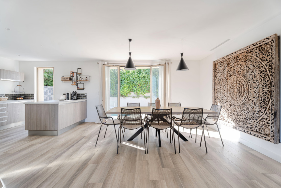 Eetkamer en open keuken met zicht op het zuidgerichte zwembadgedeelte, zomerwoonkamer met pergola.