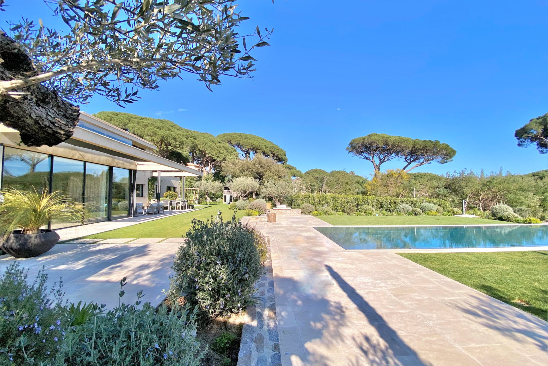 De villa is omgeven door een prachtig aangelegd terrein met uitzonderlijke ontwerpen en is verfraaid met een verwarmd spiegelzwembad van 17 x 6 meter.