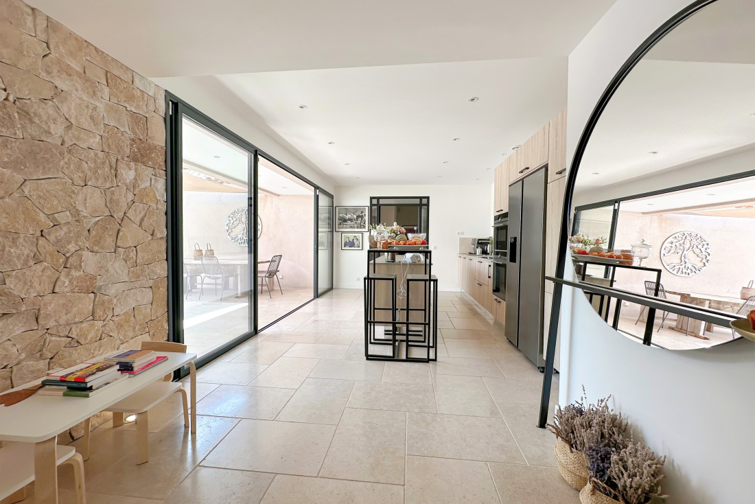 De eetkamer en ingerichte keuken geven toegang tot een groot schaduwrijk terras.
