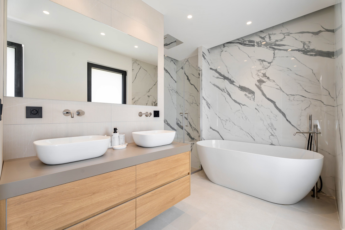 Op het niveau van de tuin bevindt zich een tweede woonkamer, 3 slaapkamers met eigen badkamer, elk met een doucheruimte, toilet en dressing.