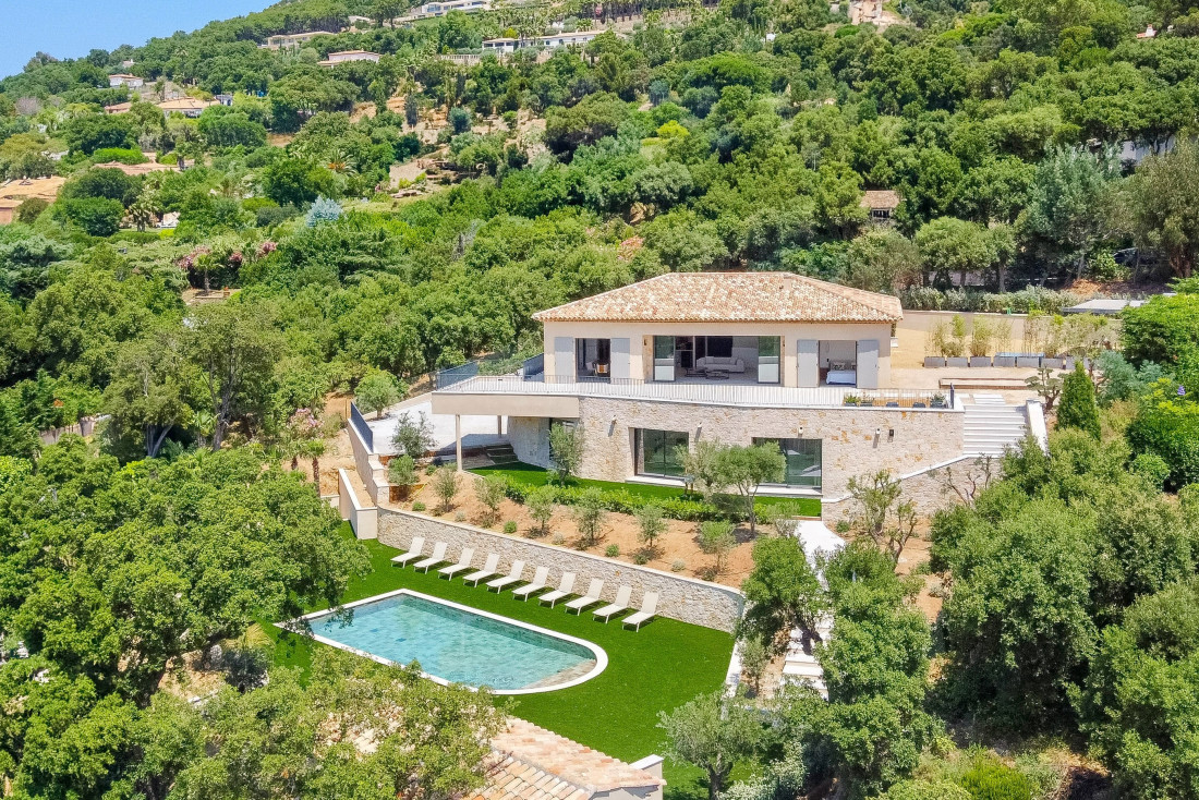 Deze villa met zeezicht is rustig gelegen op een beveiligd residentieel domein te Beauvallon Bartole in Grimaud en is zuidgeoriënteerd.