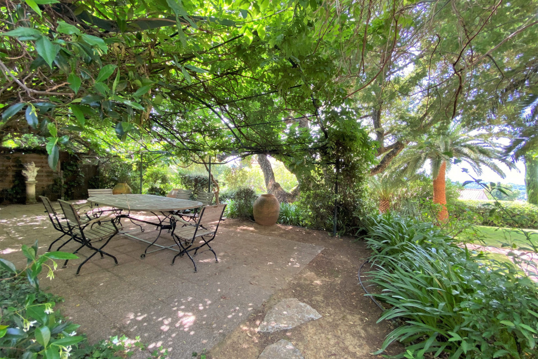 Daarnaast is er een grote ingerichte keuken met tweede eetkamer, een volledig ingerichte bijkeuken, een terras in de schaduw van een begroeide pergola.
