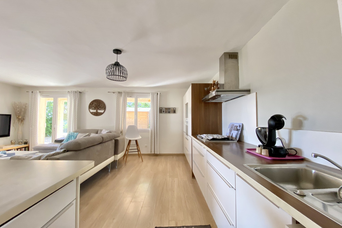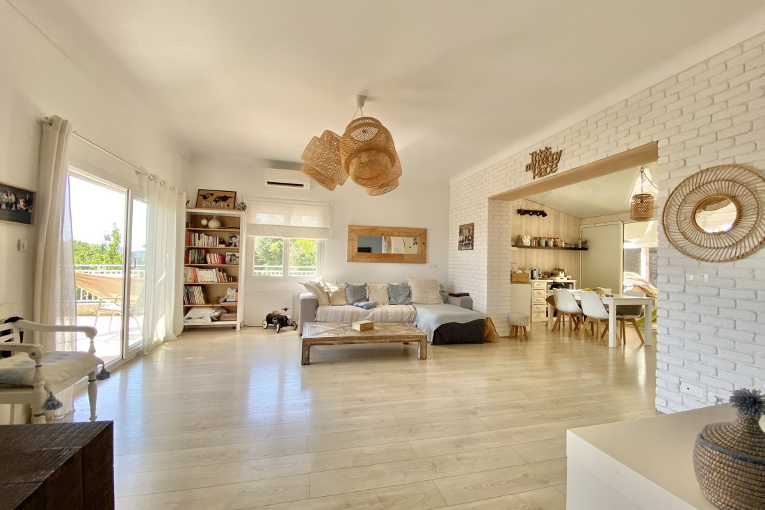 Op de bovenverdieping is er een woonkamer die uitgeeft op een overdekt terras en een ingerichte keuken met eetkamer die uitkomt op een patio.