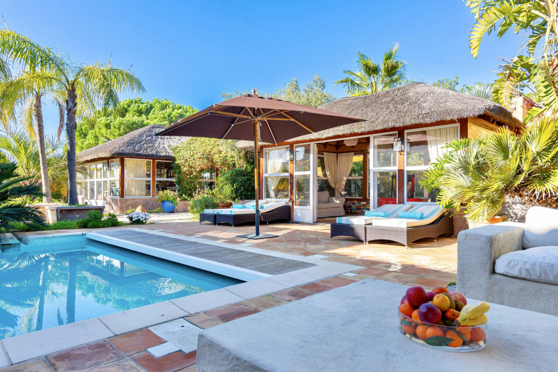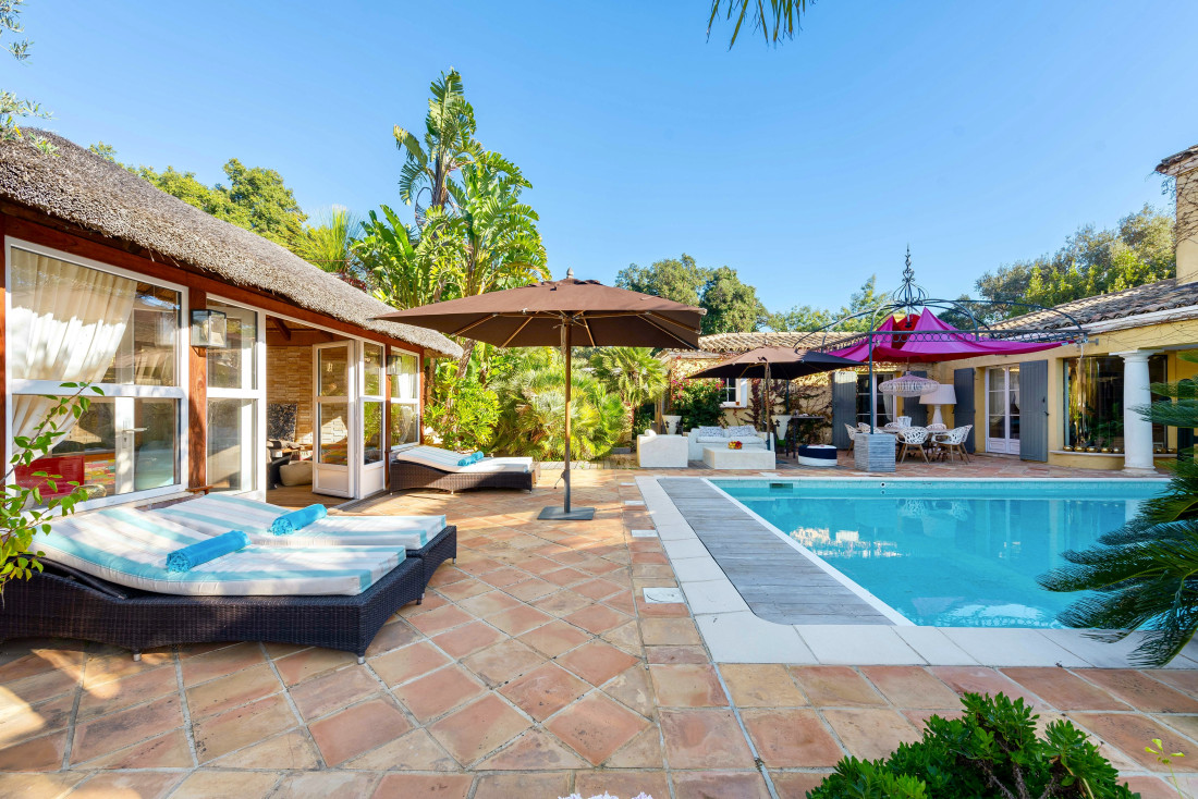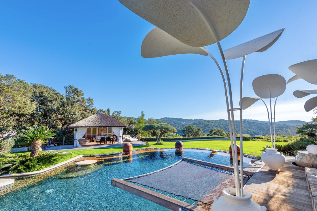 De entree brengt u naar een prachtige patio met bomen en een eerste verwarmd zwembad. Er is een speelkamer, een fitnessruimte, een schaduwrijk terras en kunstgras, een terras met jacuzzi.