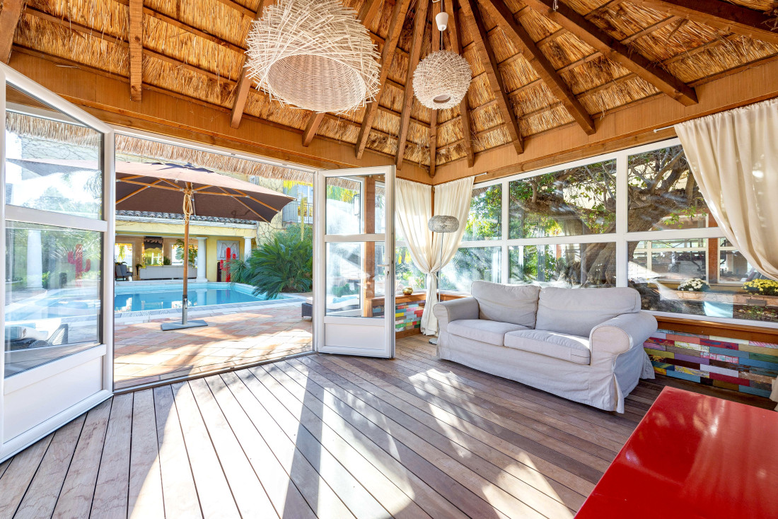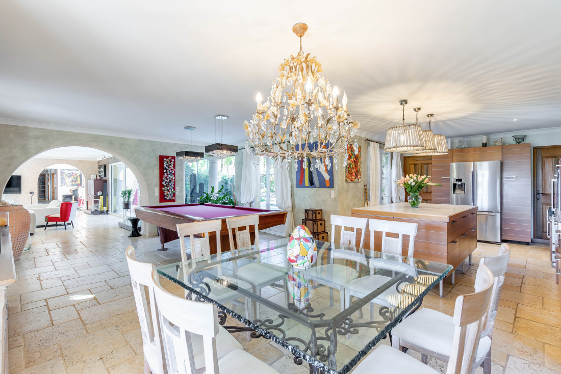 Daarnaast is er een hal met gastentoilet, een grote ontvangstruimte met zeezicht, een glazen open haard, een biljarttafel en een eetkamer met toegang tot een overdekt terras.