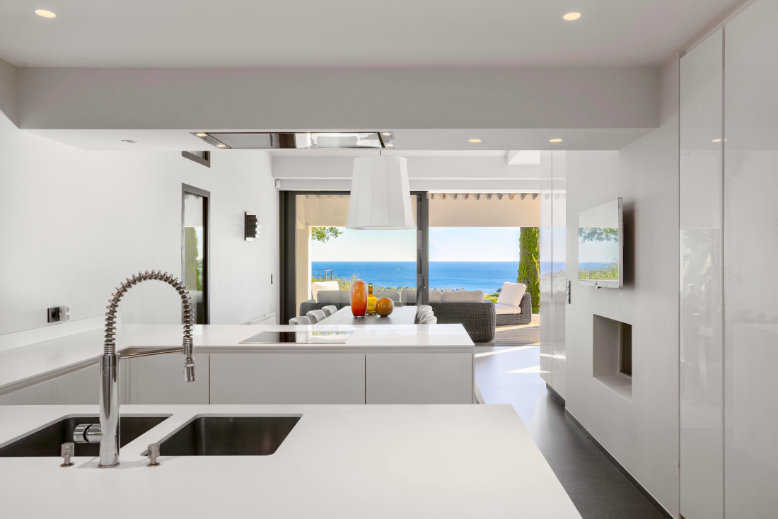 De volledig uitgeruste keuken met bijkeuken biedt toegang tot de garage, terwijl de eetkamer via een overdekt terras naar een zomer-eetkamer leidt.