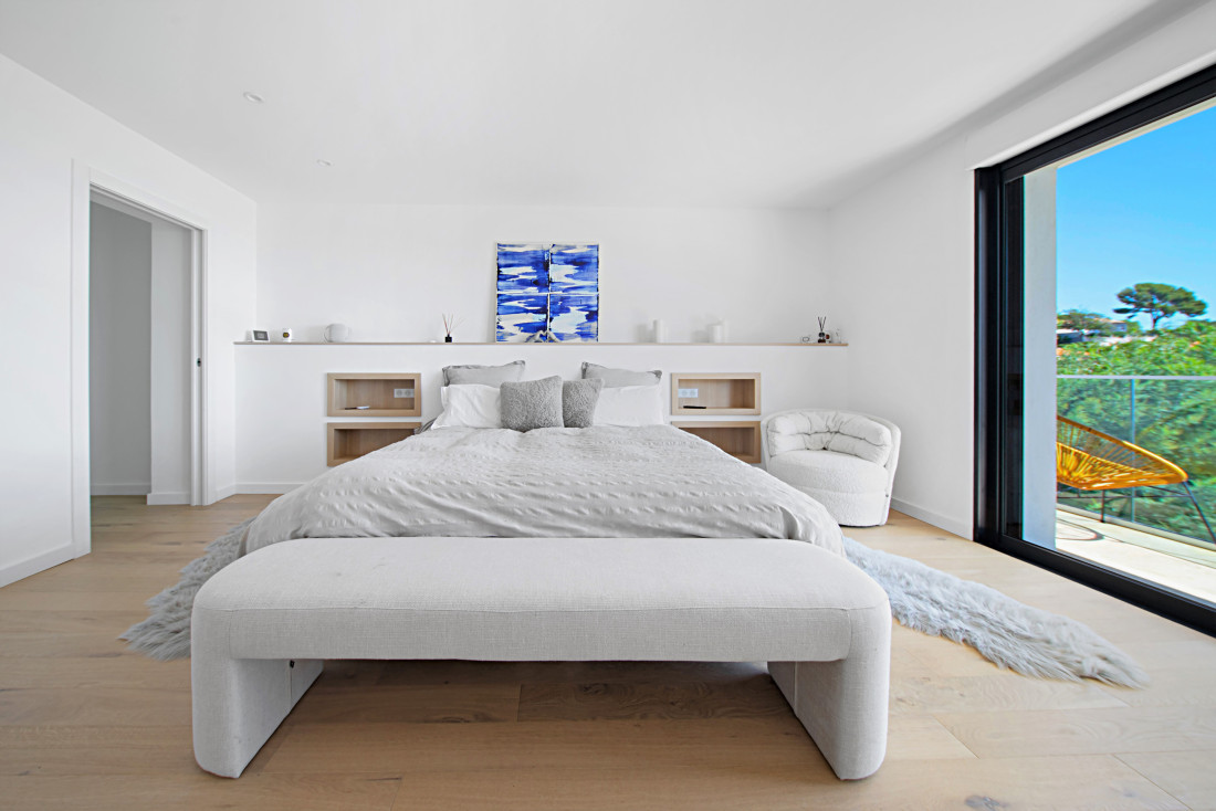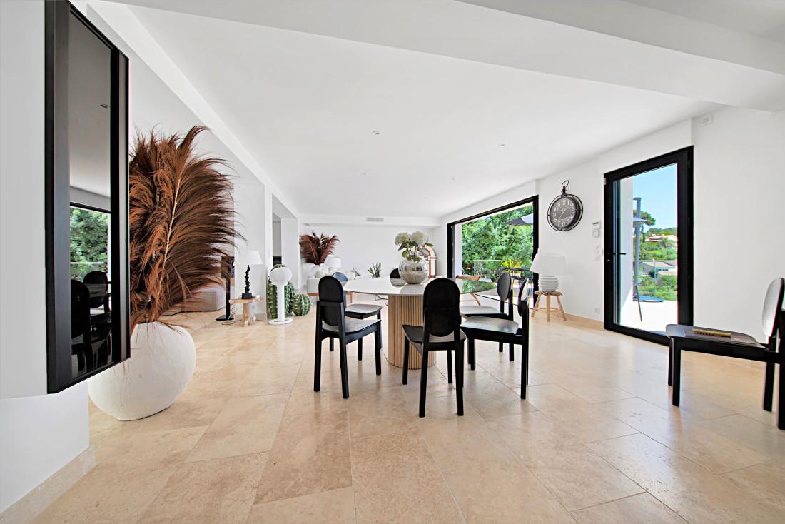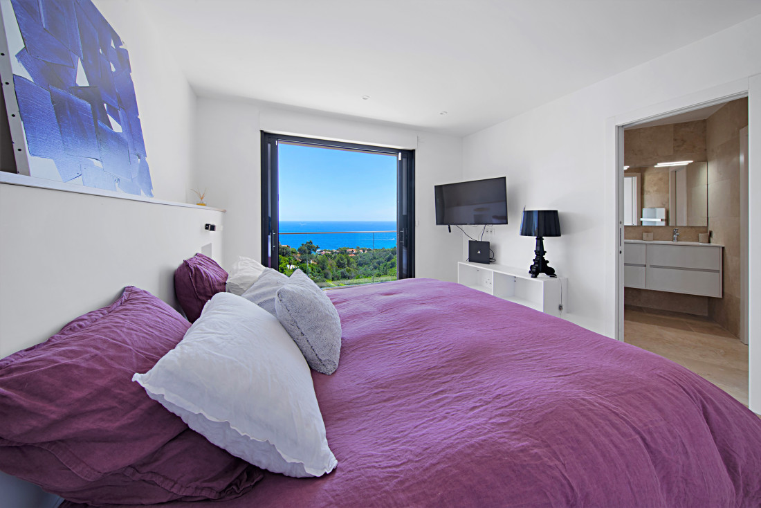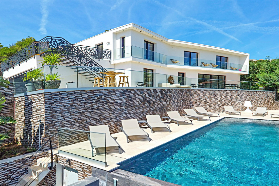 Dichtbij de zee en winkels, ligt deze lichtrijke hedendaagse villa met zeezicht en grote terrassen.