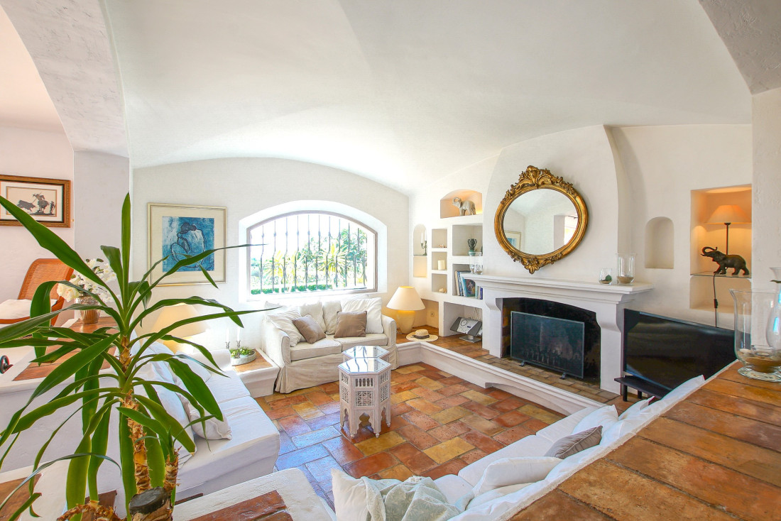 ontvangstruimte van 70m², die bestaat uit 3 delen met open haard en eetkamer die uitkomt op een groot terras met een verwarmd overloopzwembad van 10 x 5 m.